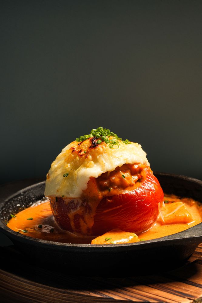 Peruvian Red Pepper, Filled with Shrimp, Finish au Gratin.